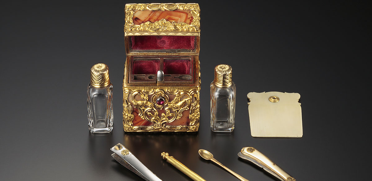 18世紀、貴族文化が成熟したヨーロッパでは、香水がその華やかさの一端を担いました。貴族たちは化粧の際、その仕上げに必ず香水を身に振りまきました。愛を表すモチーフや植物の形をしたものなど、趣向を凝らした様々な形の香水瓶が、磁器やガラス、金属等で作られました。それらからは、当時の貴族たちの高い美意識を垣間見ることができるでしょう。